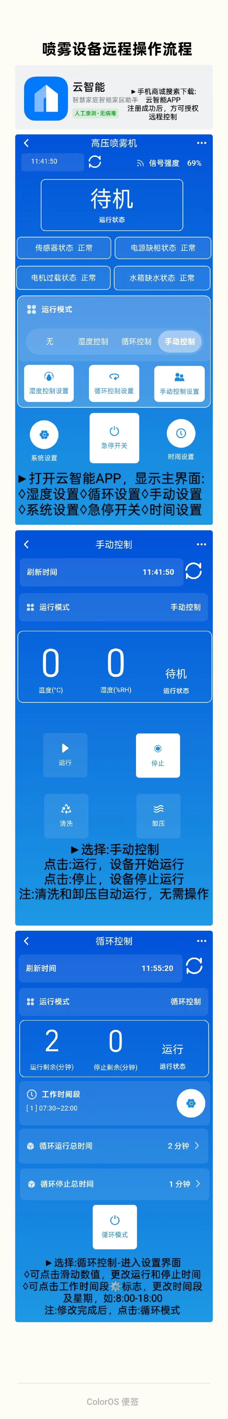 一.喷雾设备组启停流程:1 打开喷雾主机进水阀门。2 合上喷雾主机电箱内空气开关。3 确认喷雾主机箱体内的水箱水位充足。(设备背面可听见水箱进水声音,也可打开主...